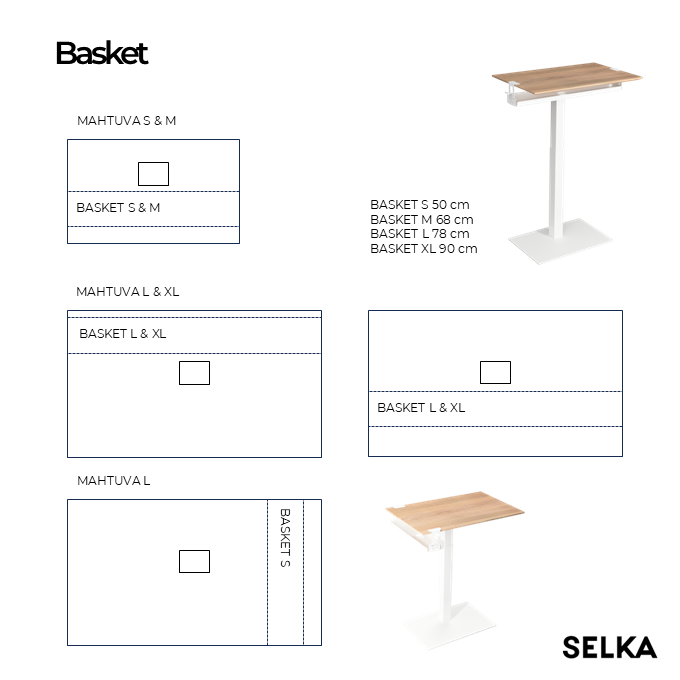 With BASKET storage unit, you get additional storage space under your MAHTUVA, SOPIVA or ELECTRO home office desk. The BASKET can be easily added to the table afterwards, no drilling required. There are four different sizes available: S, M, L and XL.